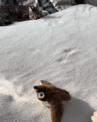 Hračka realisticky mává křídly jako skutečný pták, čímž probouzí přirozený lovecký instinkt kočky. Pohyb se aktivuje při hře a dotyku.